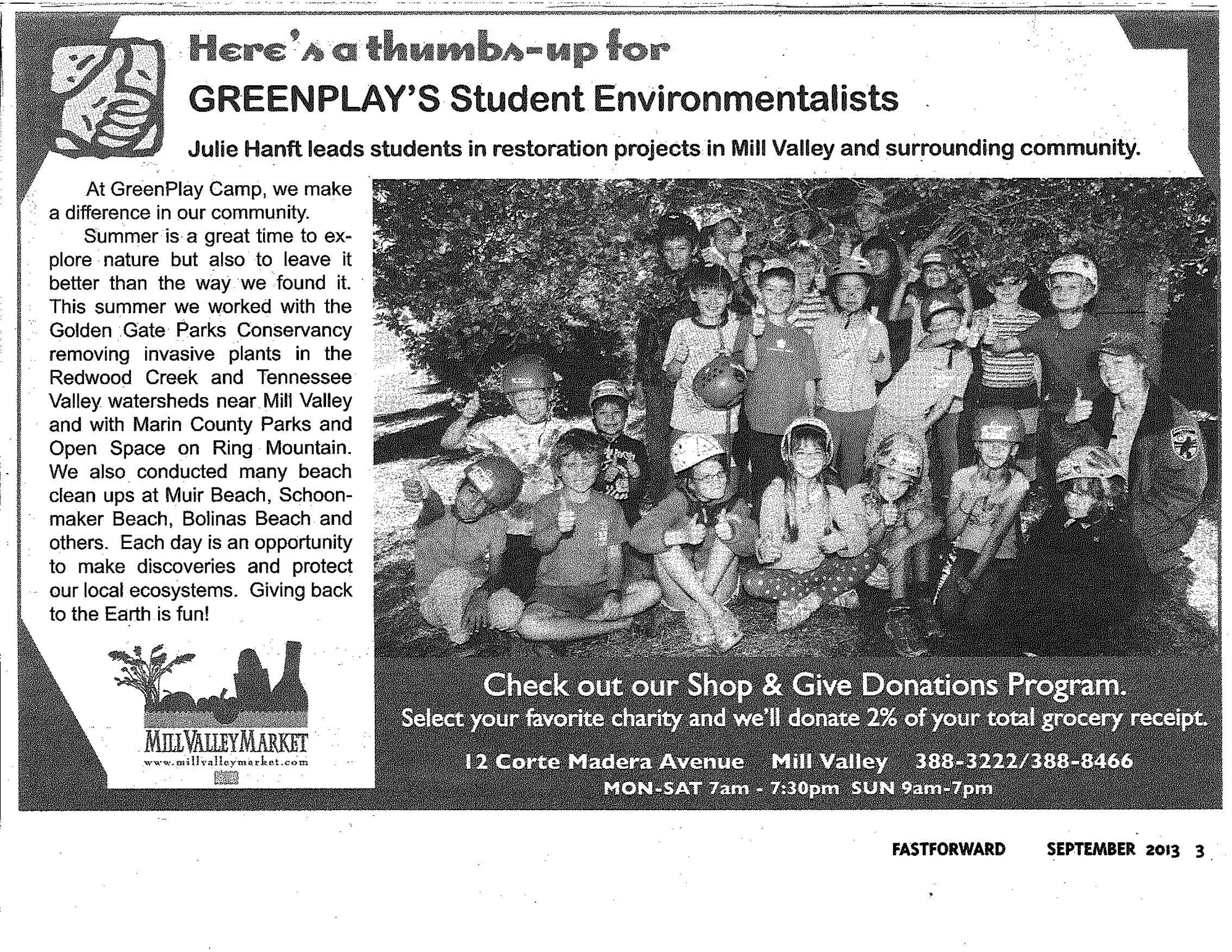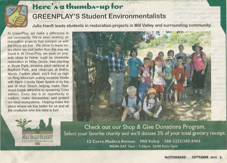 Since our beginnings in the Summer of 2010, all of Marin GreenPlay Camp’s campers have the opportunity to give back to the places we explore through service projects every week. Partners on these projects include Marin County Parks, Golden Gate Parks Conservancy, Friends of Corte Madera Creek Watershed, Mill Valley StreamKeepers and many more.